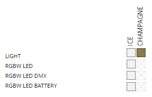 Unit with internal lighting with RGBW LED technology and remote control unit for switching colors. Also controlLED by DMX-1024 (wireless), enabling communication between one or more products simultaneously via the DMX transmitter (not included).